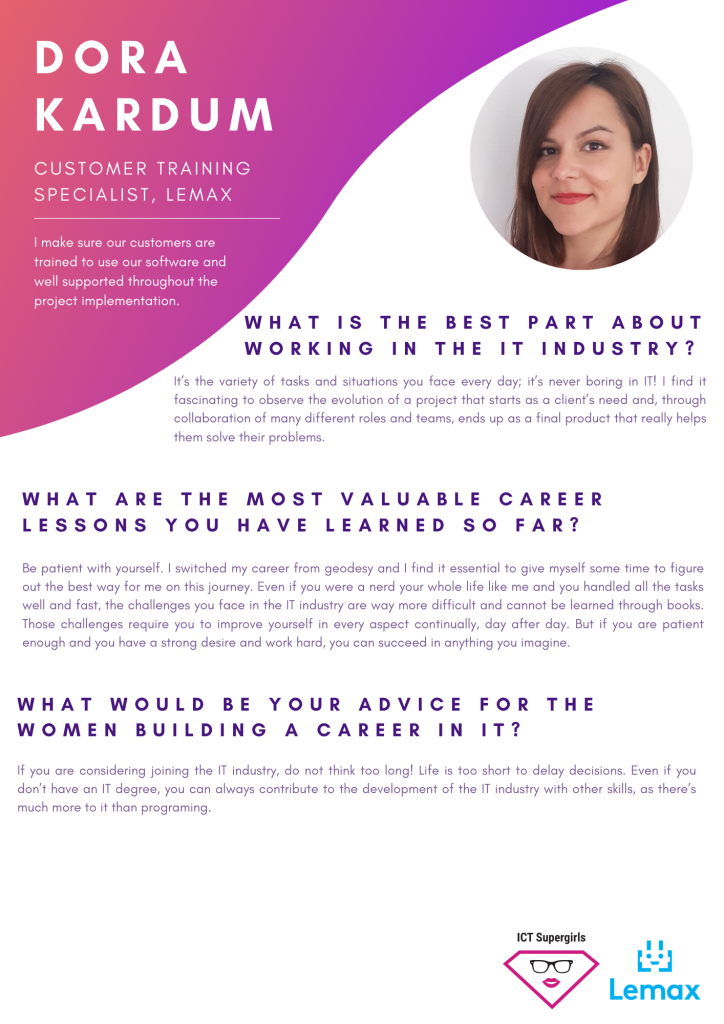 Happy Girls in ICT day of 2020! For the 6th year in a row, Lemax is celebrating this global movement inspiring girls and women to build their careers in the ICT industry. Even though this year, due to COVID-19 circumstances, we’re unable to organize a big conference like the previous years, we still wanted to honor this tradition and our female employees. We asked them to share their grains of wisdom about what it’s like to work in an IT company. And so, instead of one day, we celebrated the whole week! Here are the short stories with some powerful messages from 8 of our Lemax ICT Supergirls. We hope they inspire and empower other young women to join this dynamic and progressive industry.